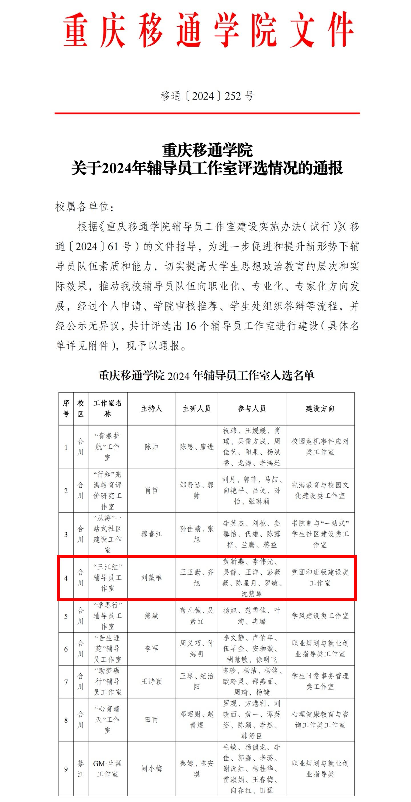 为进一步加强和提升新形势下辅导员队伍素质和能力,切实提升大学生思想政治教育水平和实效,推动我校辅导员队伍职业化、专业化、专家化建设,今年四月,学校发布关于开展2024年辅导员工作室申报的通知。由淬炼商学院学工副院长刘薇唯老师主持、李伟光等11名老师参与的创建的“三江红”辅导员工作室通过个人申请、学院审核推荐、学生处组织答辩等流程,在9月30日学校公布的16个辅导员工作室建设名单中,“三江红”辅导员工作室成功入选,主要以党建引领,带动班团组织建设,以“七个有力”,在校内引领、影响一批基层党组织,以科学工作法、丰富育人载体、创新工作思维,服务学生党建工作。