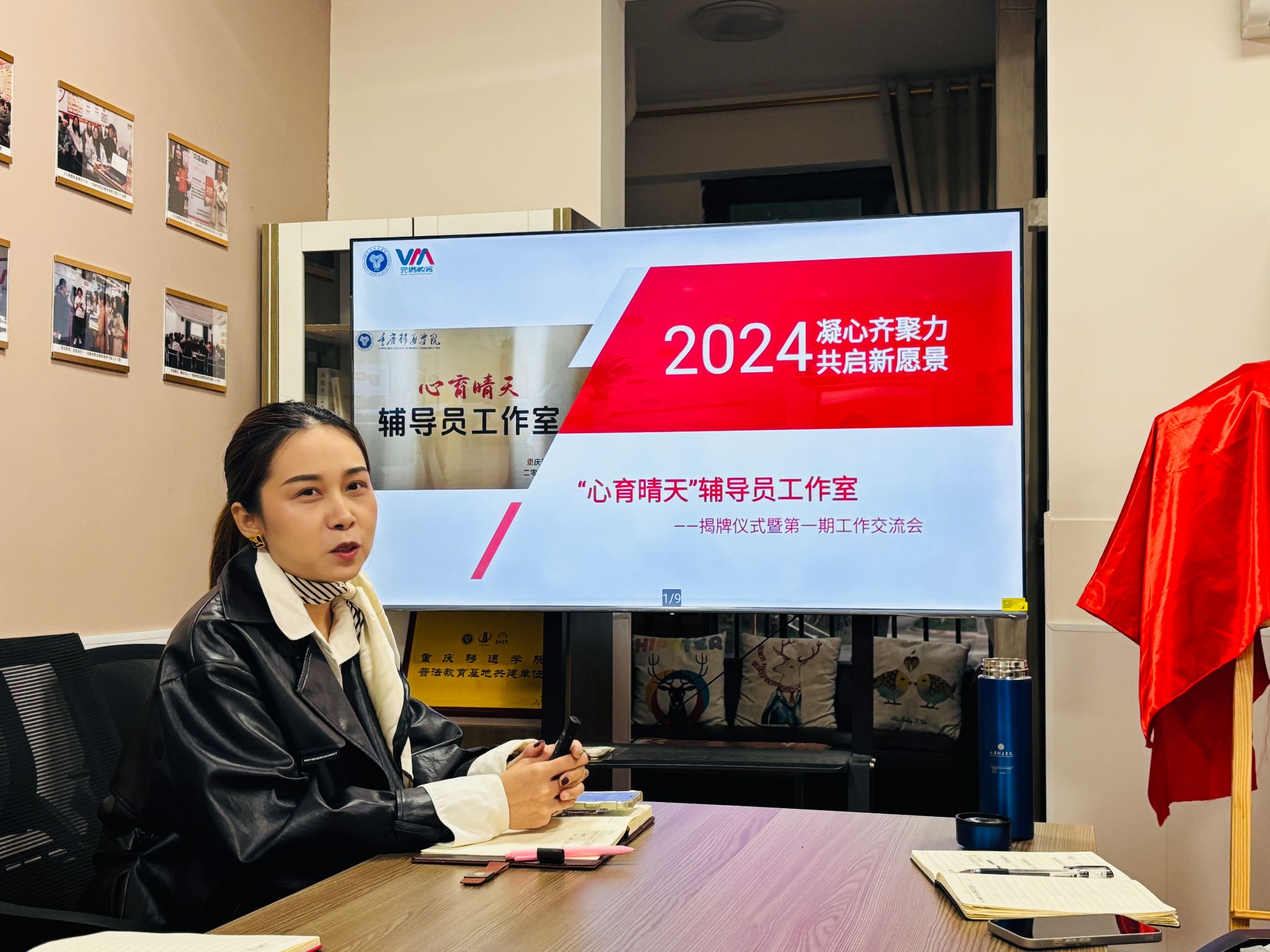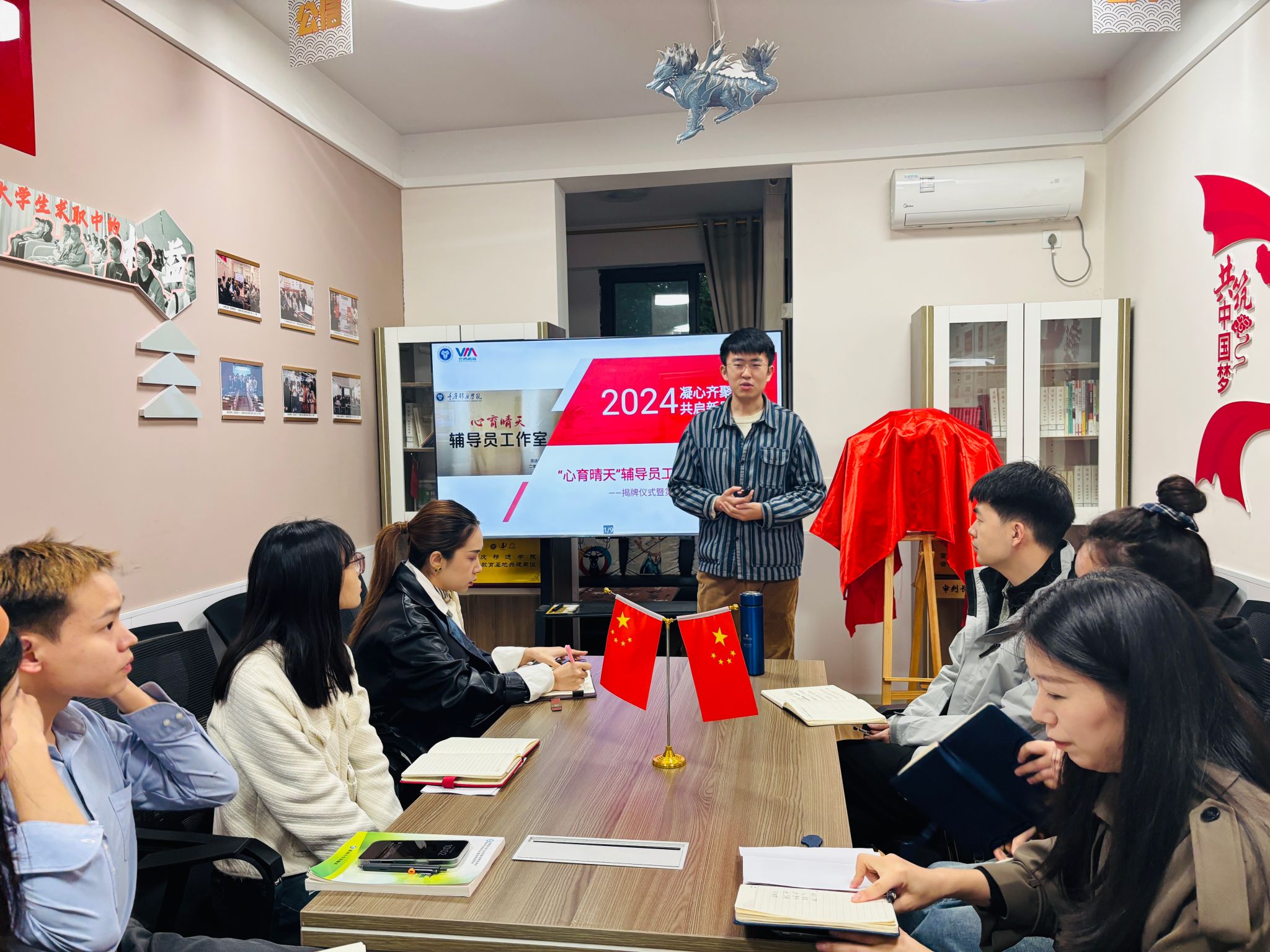 2024年11月13日上午10点,在心理健康教育与咨询中心及鱼城书院筹备下,我校“心育晴天”辅导员工作室揭牌仪式暨工作交流会于鱼城书院拉开帷幕。本次参会人员有专职心理教师田雨、邓昭财、赵青煜,各二级学院辅导员陈颖、黄一、罗观、韩舒臣、谭英姿、方港利,宿舍管理中心行政管理人员李然、学生科行政管理人员刘晓西,参会人员共计11人。