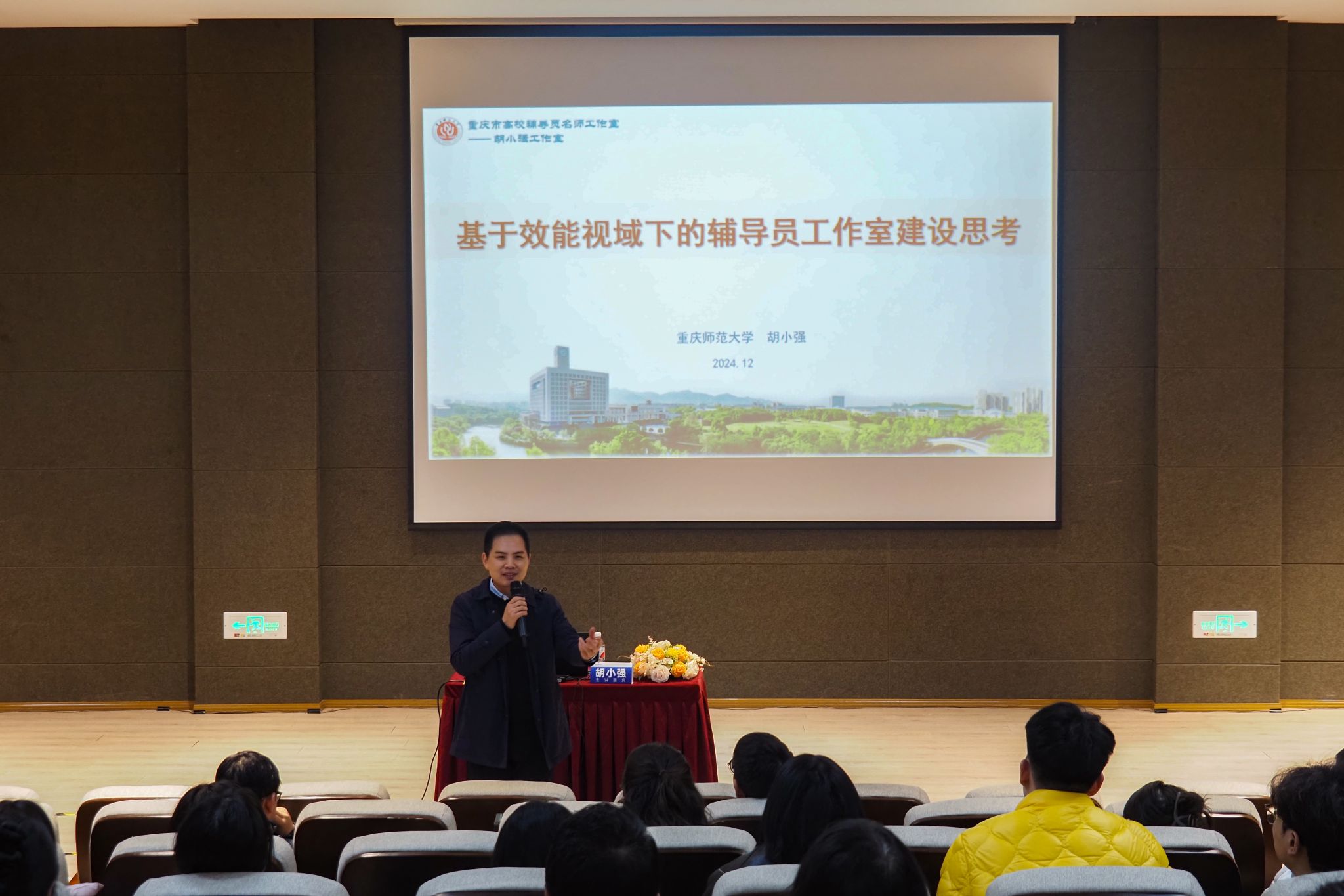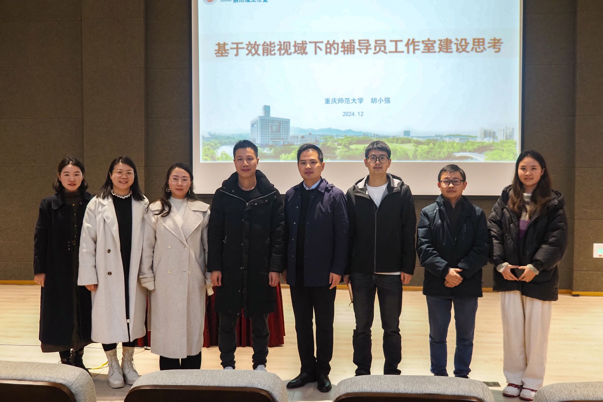 为增强我校辅导员团队的综合能力,塑造一支更加专业化、高效率的辅导员队伍,以便为学生提供更加周到、深入的指导与服务,我校于12月3日下午,特邀重庆师范大学学工部部长胡小强在六度空间无限功能厅举办以“基于效能视域下的辅导员工作室建设思考”为主题的专题讲座。此次讲座由学生处处长陈帅主持,全体辅导员及校级辅导员工作室成员积极响应,共同享受这场知识的盛宴。