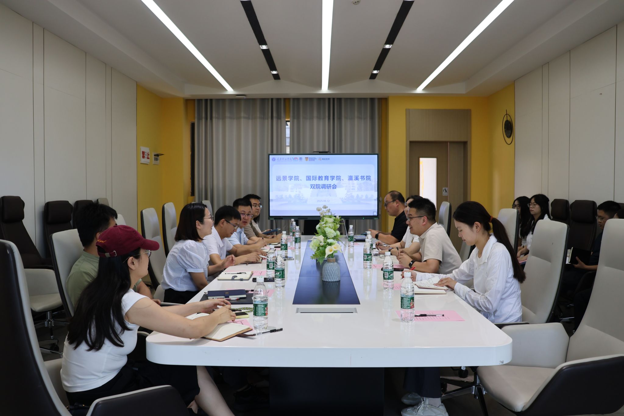 2025年6月12日14:30,远景学院、国际教育学院、瀛溪书院双院调研会于瀛溪书院一二三亖会议室召开。副校长李文豹、校长助理梁少锋、学生处副处长唐尚静、书院部部长曹玉姣、艺术教育中心主任程燕、竞技体育中心副主任江华、就业创业指导与服务中心副主任毛敏等领导莅临指导,远景学院、国际教育学院副院长,学工团队全体老师参会。会议由远景学院教学副院长强杨主持。本次会议围绕双院育人实践、资源整合及特色发展深入交流,为构建高质量育人体系凝聚智慧。