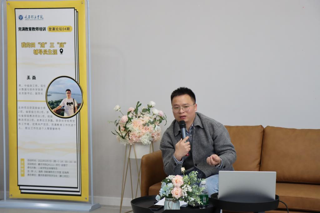 大数据与软件学院党总支副书记、副院长王焱老师担任本次论坛主讲人,他以七年半的辅导员经验为切入点将辅导员最常规、最基本的工作娓娓道来。他提出“四进三底”是辅导员最重要的基本,以此为出发点去处理事情没有技巧,只能踏踏实实去做,用“四进”指明工作方向,用自身的行动去证明靠近学生,进课堂绝不仅限于查课、进宿舍绝不能走马观花、进活动绝不只是指挥者、进内心绝不流于形式;用“三底”恪守工作准则,用自身的行动去担当责任,紧守底线,坚守底色、加深底蕴。他认为,辅导员工作很平凡、琐碎,唯有一步一脚印才能“守得云开见月明”,通过分享一句话:“青年说,请不要走在我后面,我可能不会引领;请不要走在我前面,我可能不会跟随;请走在我的身边,做我的朋友。”来告知各位老师在与学生相处的过程中需要和学生成为朋友,“参与”“陪伴”“见证”等几个关键词都是解决问题的突破点,在学生需要他的时候他从未缺席,尝试参与各类活动,加入学生、融入学生,示范引领学生;学生的各类排练,默默地陪伴,给他们拍照、录视频,记录他们奋斗的点点滴滴,给学生身体上、心灵上带来鼓励和安慰;学生的各类比赛,他赛前打气、赛后点赞,拍合照,见证学生荣耀时刻,以辅导员的身份带给学生最大的认同感。