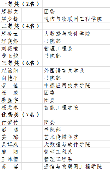 本次大赛通过笔试初赛,完满教育主题演讲、案例分析及谈心谈话三个环节的决赛,根据最后综合成绩最终团委唐彬文、通信与物联网工程学院梁少锋获得一等奖,大数据与软件学院唐凌云等4人获得二等奖,外国语言文学系纪治阳等6人获得三等奖,团委付梦竹等7人获得优秀奖。