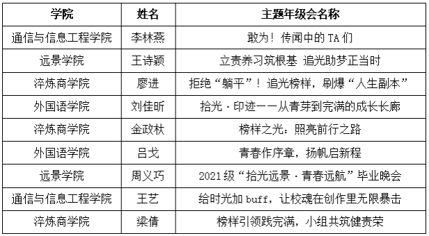主题年级会是我校大学生思想政治教育的重要环节,是我校完满教育开展的重要形式。为表彰优秀,树立榜样,进一步提高我校主题年级会开展的质量。根据《重庆移通学院主题年级会实施方案》的文件精神,通过辅导员自主申报、学生评审小组现场观摩、教师评审小组综合评分三个环节,最终评选出李林燕等9位辅导员的主题年级会为2025年6月优秀主题年级会。具体名单如下: