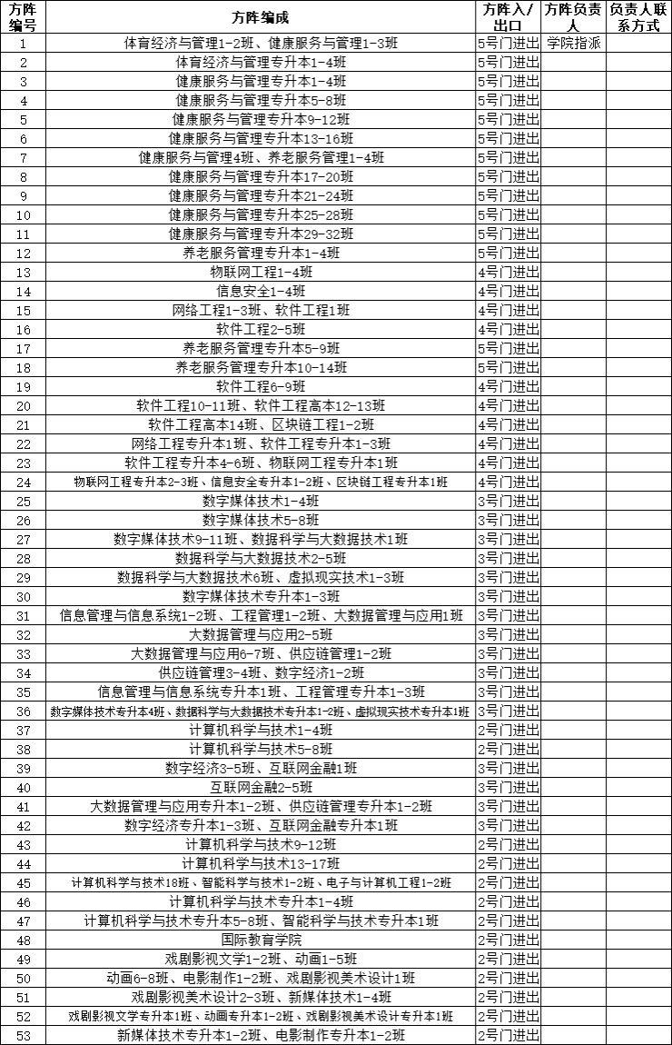(一)典礼全场共53个方阵,每个方阵由4-7个自然班组成,各学院提前查看每个方阵的组成班级,便于通知各班提前知晓自己的方阵编号;