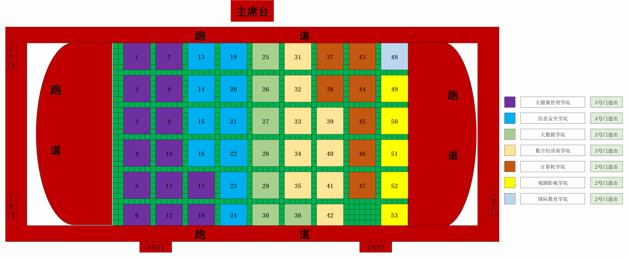 (三)各方阵提前在田径场外集合整队,队列整顿好之后由各方阵的负责人带队错峰、有序入场(建议按照方阵编成表中分配的入口入场),所有方阵需在7:30前在田径场内按照对应的方阵编号及田径场内的地标列好队形;