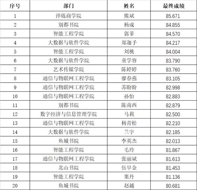 为进一步加强完满教育系统教师队伍建设,提高业务能力,根据《重庆邮电大学移通学院完满教育教师职业能力竞赛组织管理办法(试行)》(移通院﹝2018﹞24号)、《重庆邮电大学移通学院关于举办第三届完满教育教师职业能力大赛的通知》(移通院〔2020〕104号)等文件精神,学校于近期举办了第三届完满教育教师职业能力大赛,本次大赛分为笔试形式的初赛,完满教育主题演讲、案例分析及谈心谈话三个环节的决赛,现将比赛最终成绩公示如下: