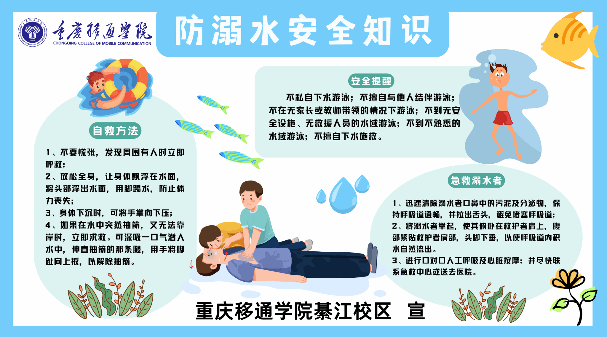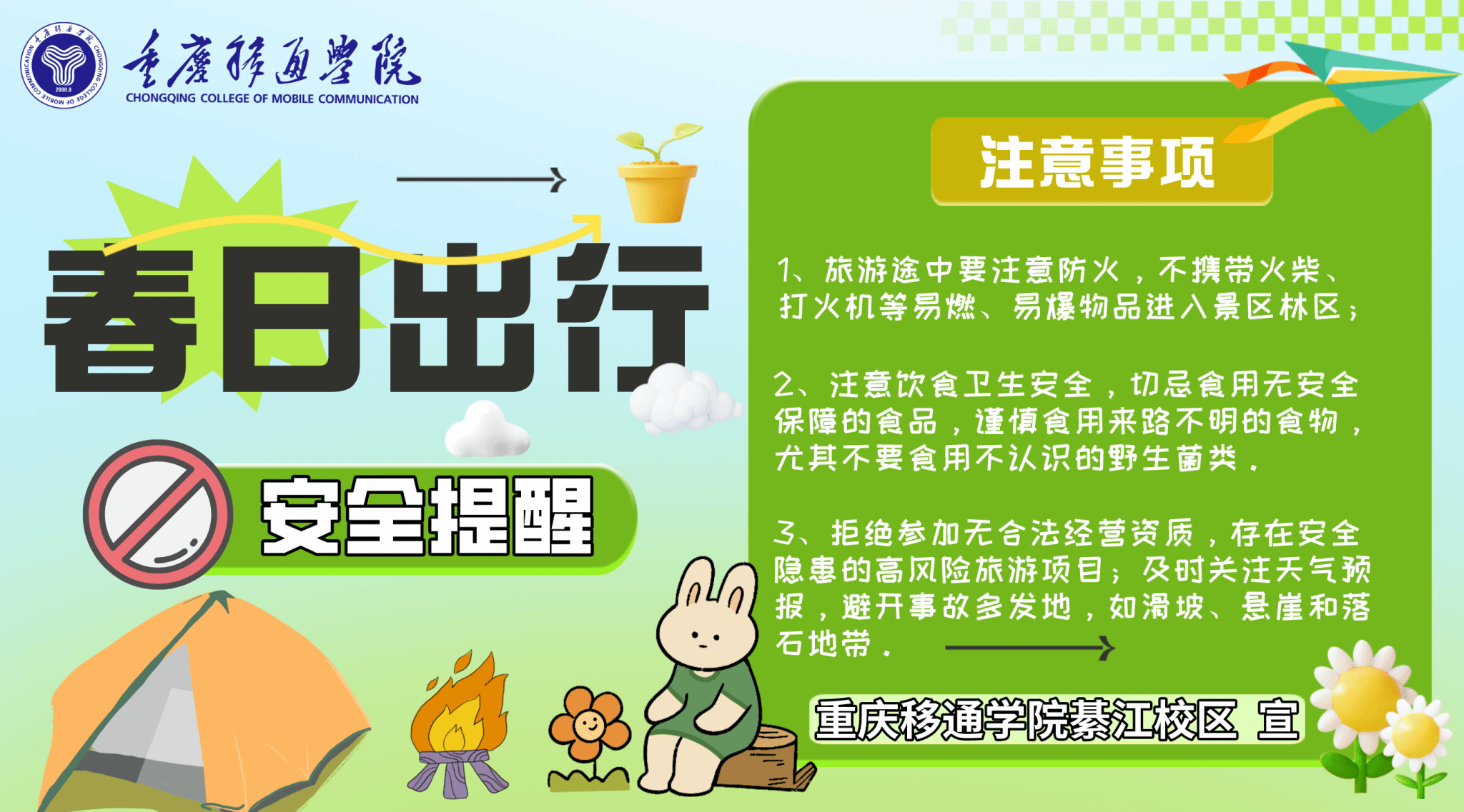 2.注意人身安全。加强体质锻炼,提高身体素质,增强免疫力;加强防溺水意识,不得私自下水游泳、到不熟悉无安全措施及救护人员的陌生水域游泳,遇到溺水情况视自身情况救援,不要盲目施救;外出踏青时,注意预防花粉过敏;游玩时,拒绝危险举动,确保人身安全;不要夜间独自外出游玩、访友;禁止参加非法宗教和传销等违法活动。