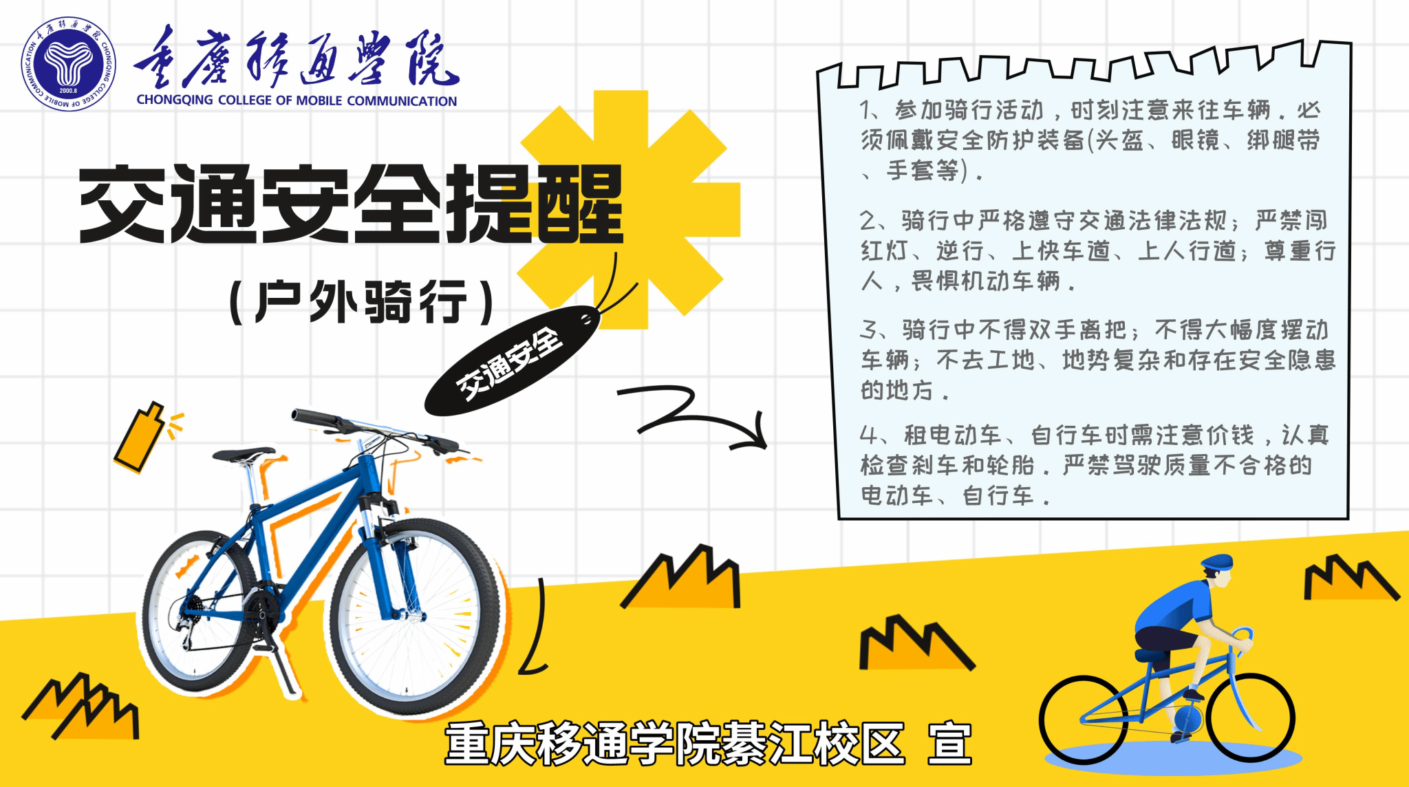 3.注意交通安全。自觉遵守交通规则,不在马路上嬉戏打闹,禁止乘坐非法运营车辆(三轮车、摩托车、轿车、违章车辆),校外骑行自行车、电动车等交通工具时,不前往地势危险区域,注意来往大型车辆;外出、探亲、访友,请勿酒后驾驶、疲劳驾驶、无照驾驶,避免交通事故发生;长途旅程的同学要结伴而行,不单独回家。