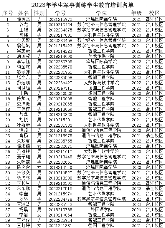 本次大赛坚持公开、公平、公正的原则,在推荐、自荐的基础上共通过笔试和面试两个环节的选拔,最终选定40名退伍学生参加后期的军事训练教官培训,具体名单如下(按排名先后顺序):