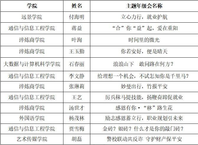 主题年级会是我校大学生思想政治教育的重要环节,是我校完满教育开展的重要形式。为表彰优秀,树立榜样,进一步提高我校主题年级会开展的质量。根据《重庆移通学院主题年级会实施方案》的文件精神,通过辅导员自主申报、学生评审小组现场观摩、教师评审小组综合评分三个环节,最终评选出付海明等12位辅导员的主题年级会为2023年10月优秀主题年级会。具体名单如下: