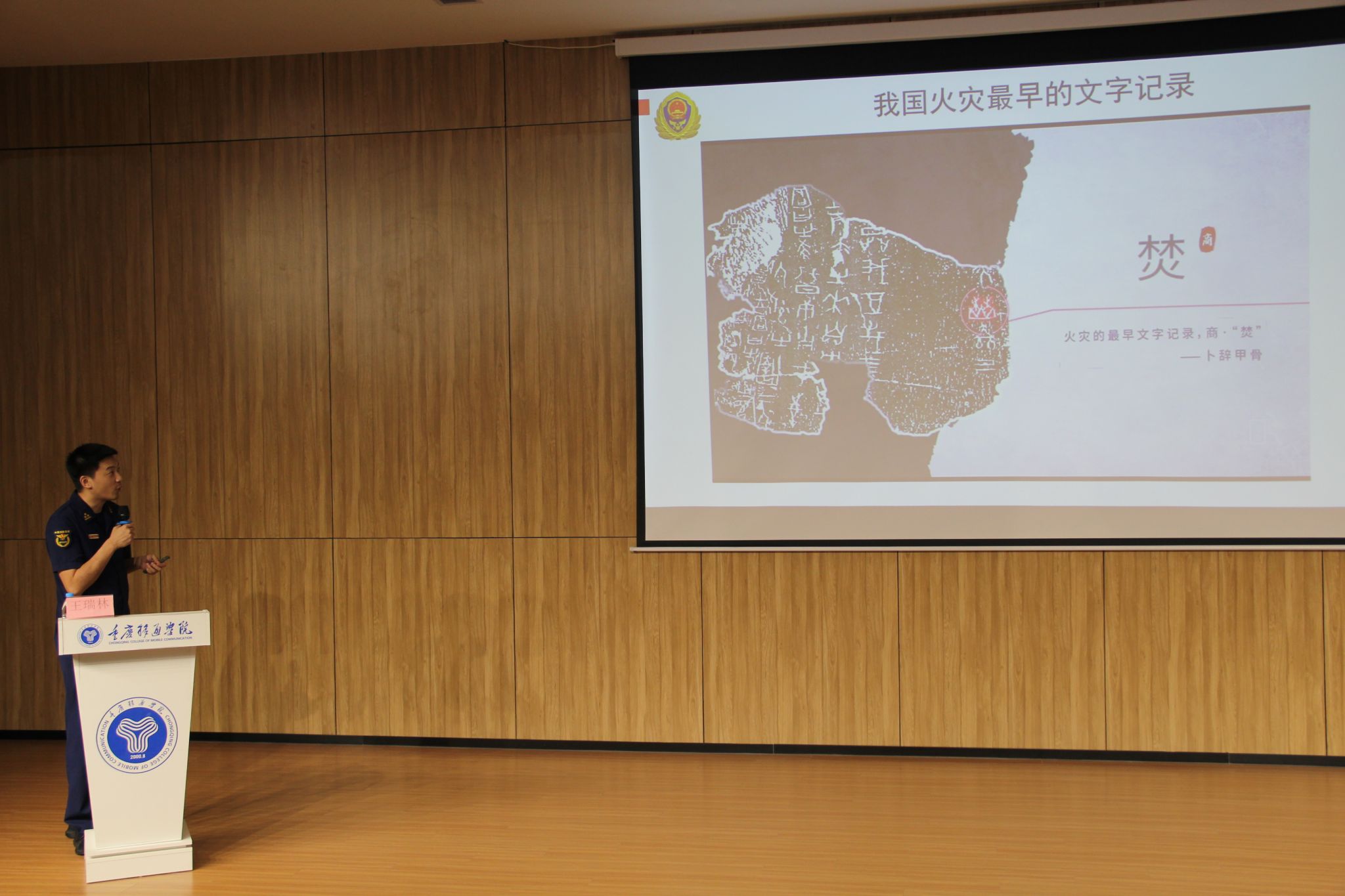 王瑞林主任主要从三个方面进行讲解,从消防的历史变革到历朝历代的防火措施,如“管仲修火宪”“古建筑藻井”,汉代的望火楼,晚清的水龙车等内容吸引同学们的兴趣,引领大家走进一幅生动的“消防历史画卷”。