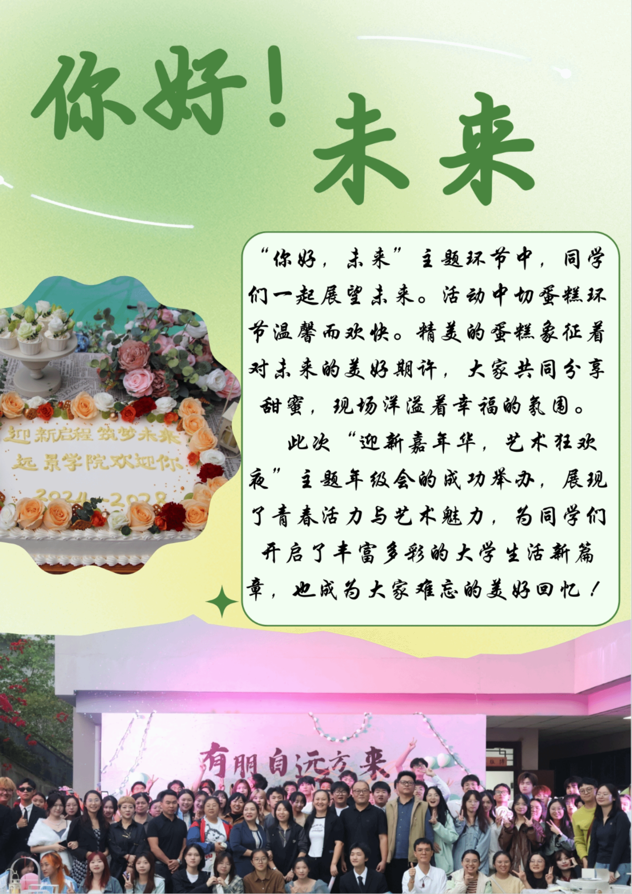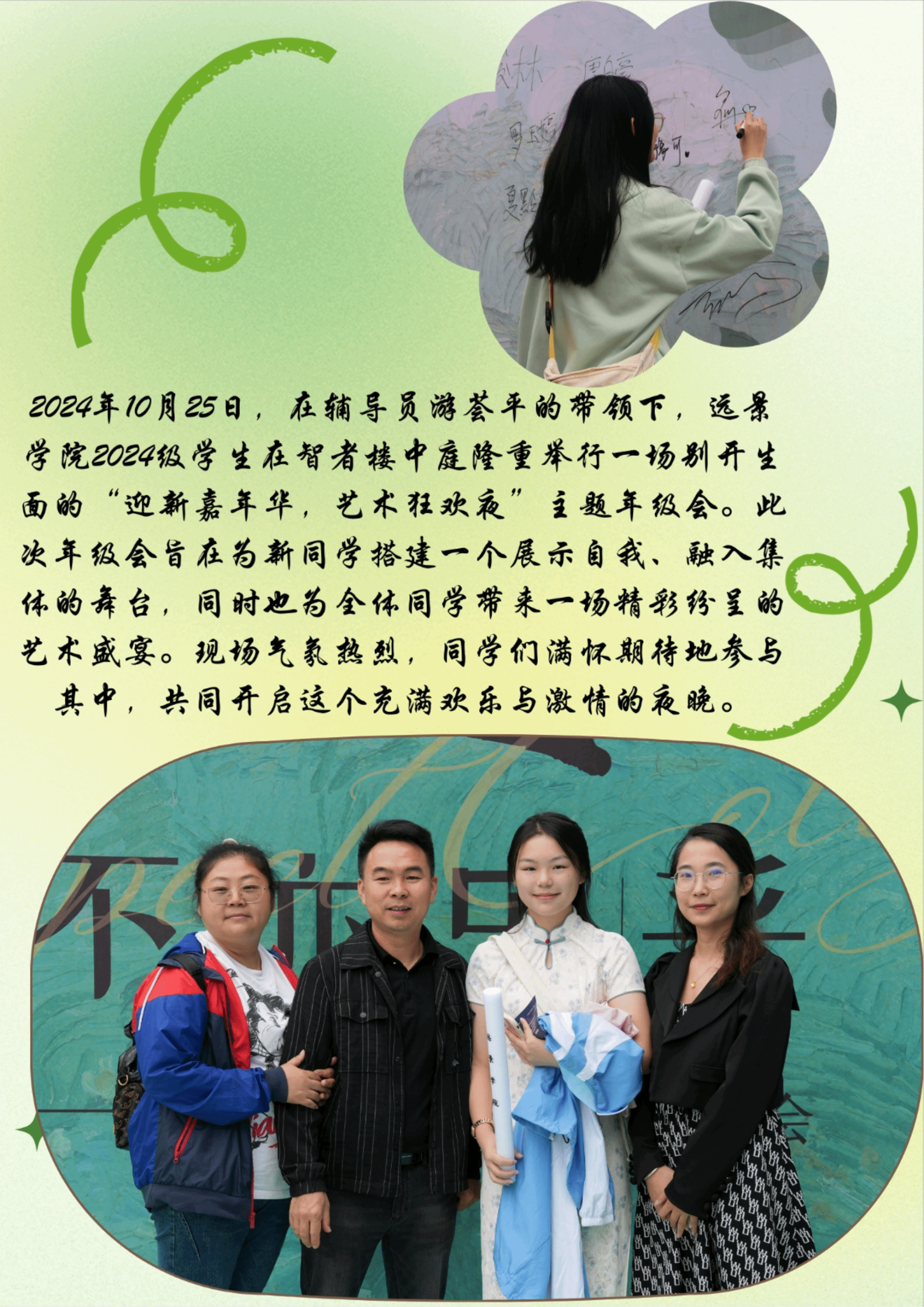 在活动中增设家长环节,其目的一方面在于建立家校互动信任基础,让家长直观了解校园文化。一方面有利于新生身份转变。当新生在家长见证下完成签到引导、自我介绍等环节时,能强化其身份转变意识,从“被照顾者”成长为“自主管理者”。这种“家庭-学校-学生”三方共育模式,既满足家长参与需求,又为后续协同育人奠定基础。
