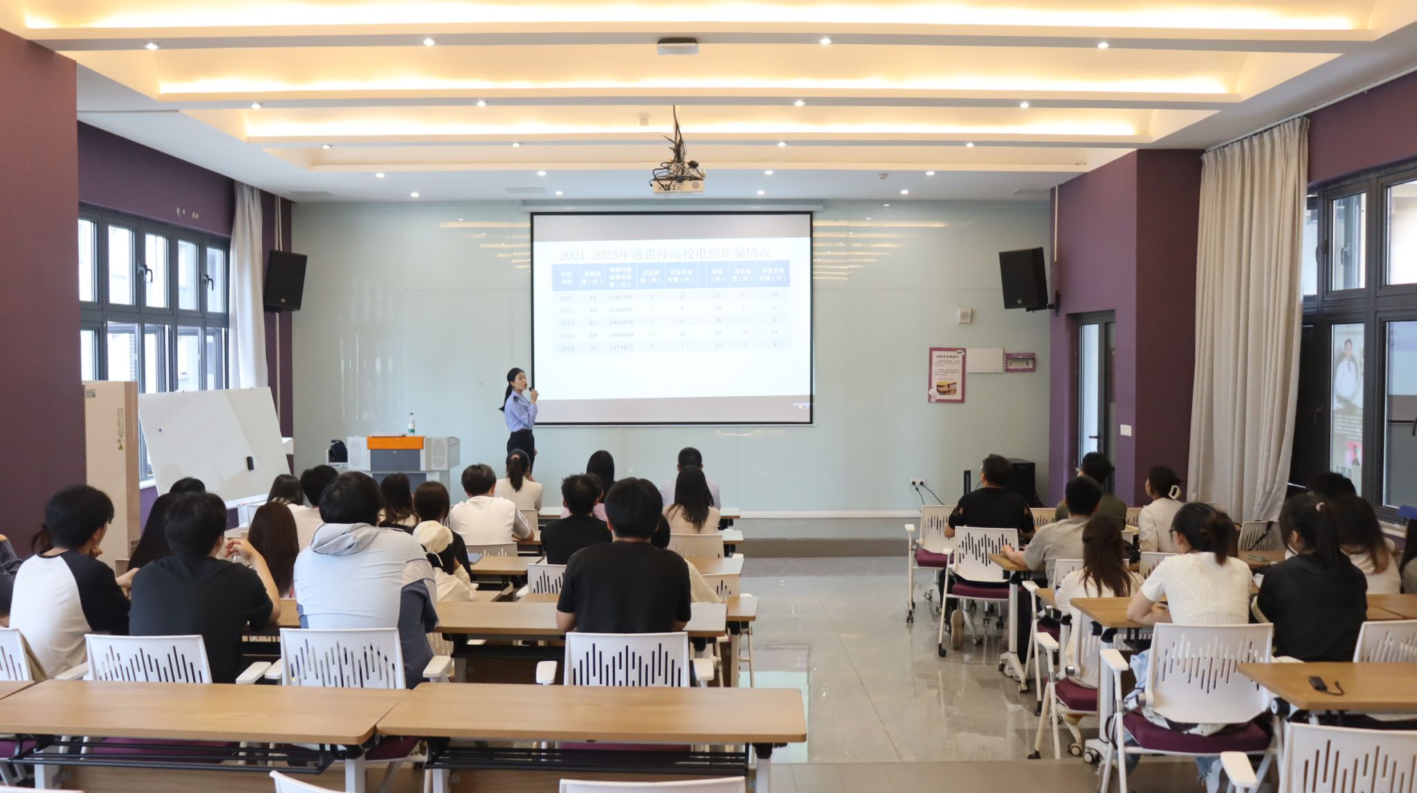 綦江区反诈骗中心余燕妃警官以2021-2025年辖区涉校诈骗数据为切入点,通过可视化图表呈现近五年案件数量、涉案金额及受骗群体结构变化,展现出高校已成为电信诈骗的重点侵害领域,让师生们直观地了解到电信诈骗的高发态势和严重危害。