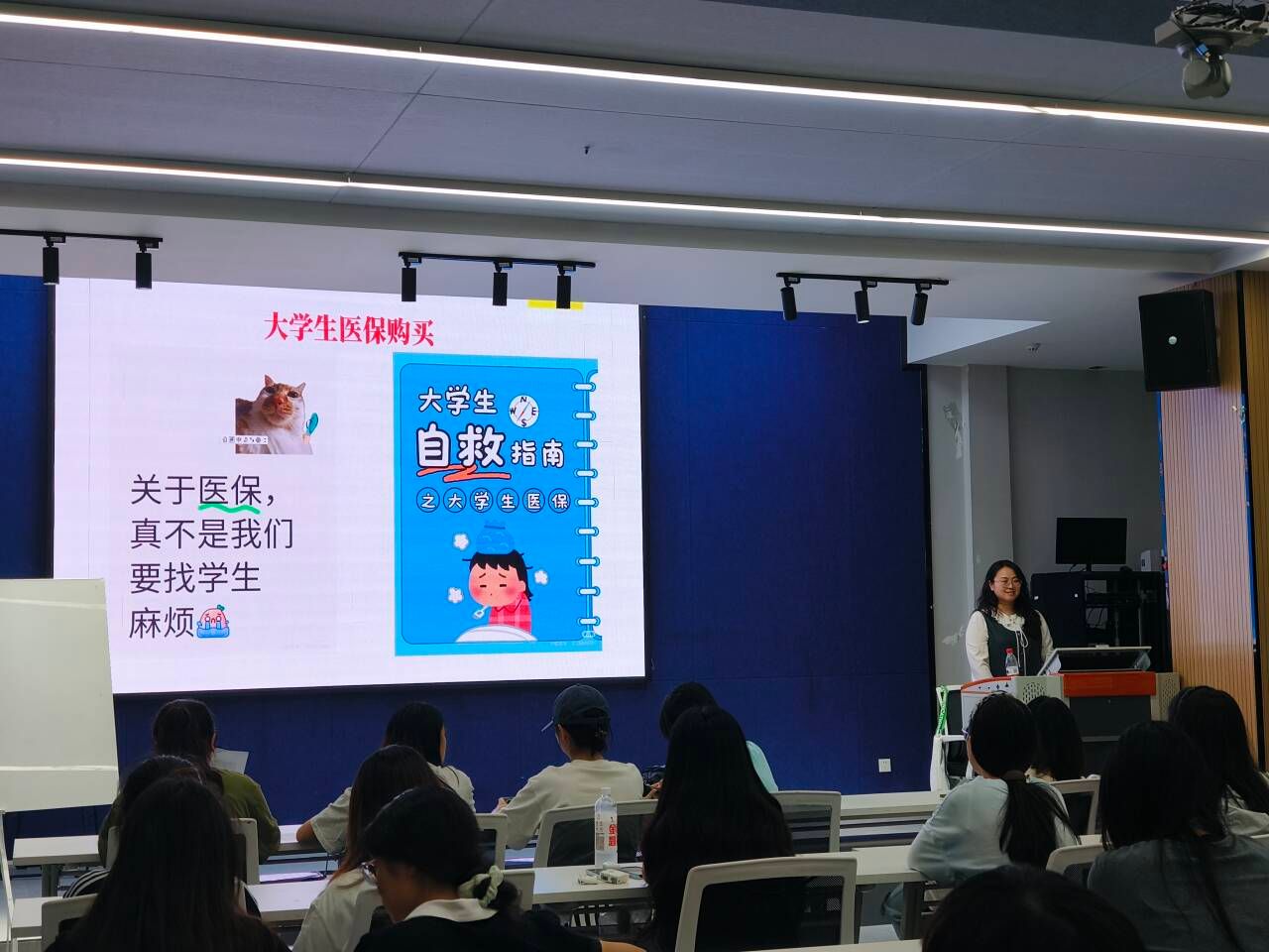 宣讲活动中,辅导员围绕医保核心要点展开解读:明确大学生医保作为国家基本医疗保险的普惠属性,通过对比商业保险、家庭医保,突出其保费低、财政补助高、保障全的优势,涵盖普通门诊、住院、特殊病种、意外伤害等场景,详细讲解线上线下参保缴费流程、市内直接结算与异地就医备案规则,特别针对大四学生外出实习需求,强调异地医疗风险应对要点;同时解读困难学生资助政策与连续参保的重要性,避免断保影响权益。